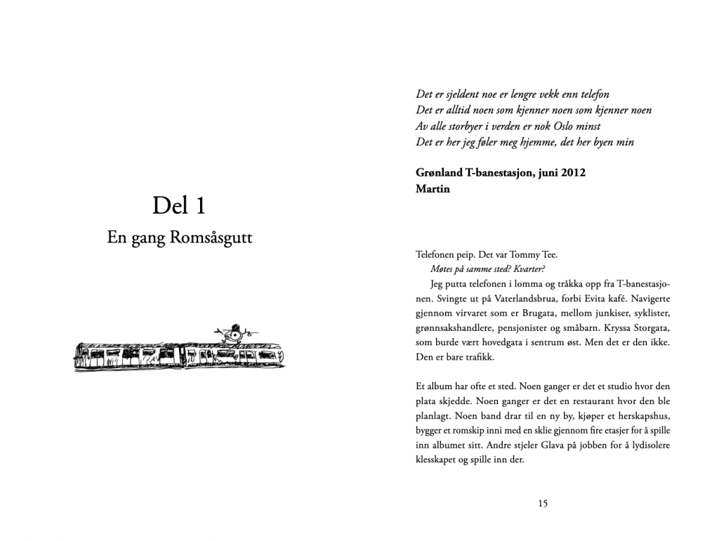 I boka vår får du høre om tankene som blant annet ledet til albumet «En Gang Romsåsgutt Alltid Romsåsgutt», «Blokk til blokk» og boka «Tante Ulrikkes vei». Om byen vår og musikken som formes av den. Fra en blokk på Grorud senter til taket på et hotell i Trondheim. Og det er en bok om oppvekst – som skriker til den tida vi er midt i nå. Så mye at jeg stod og hissa meg opp utenfor en fritidsklubb på Holmlia denne uka: